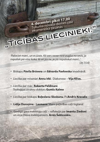 Pirmoreiz Tukumā, 4.decembrī (sākums plkst 17.00), novada domes zālē notiks ekumeniska tikšanās „Ticības liecinieki”. Tajā interesentiem būs iespēja iepazīties ar izcilu latviešu tautas ticības apliecinātāju garīgo mantojumu. Tikšanos vadīs Tukuma ev. lut. baznīcas prāvests Mārcis Zeiferts un Arnis Šablovskis.