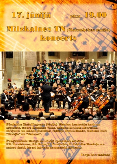 17. jūnijā plkst. 19.00 Milzkalnes TN Šlokenbekas muižā notiks koncerts. Piedalās: Zindelfingenas (Vācija) Martina kantorāta koris un orķestris, tenors Kristiāns Vilms, obojists Ziglinds Akermans, diriģents un mākslinieciskais vadītājs Matias Hanke, TKN ‘’Vanema’’. Programmā: Garīgā un laicīgā (pasaules) mūzika: F.B. Mendelsona, J.S.