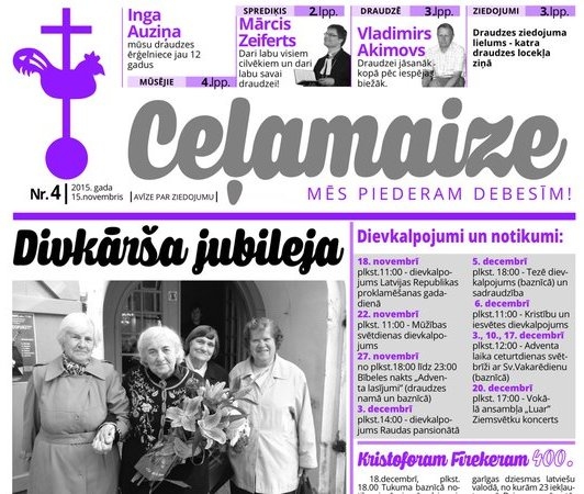Dienas gaismu ieraudzījis jaunais „Ceļamaizes” izdevums, kas baznīcā būs pieejams svētdien, 15. novembrī, bet elektroniskajā versijā ir jau lasāms šobrīd draudzes mājas lapā. Avīzi meklēt sadaļā „Pierakstīties jaunumiem un avīzei „Ceļamaize”” kreisajā malā vietnē „Lejuplādēt”. Draudzes jaunajā avīzē var lasīt interviju ar draudzes ērģelnieci Ingu Auziņu un draudzes priekšnieku Vladimiru Akimovu, kā arī citus rakstus. Tā kā šīs avīzes tēma ir dievnama mūzika, tad lasītājus iepazīstinām ar izcilo dziesminieku Kristoforu Fīrekeru, kuram šogad aprit 400. Fīrekers savu mūža nogali ir pavadījis Tukumā, un šis fakts Fīrekeru ar Tukuma draudzi vieno īpašā veidā. Bez tam draudze ar avīzes „Ceļamaize” starpniecību mudina iepazīties ar tikko iznākušo Dziesmu grāmatu, kuru dievkalpojumos sāksim lietot jau ar 1. Adventi. Ja jūs vai jūsu tuvinieki vēlaties saņemt avīzi savā pastkastītē, dariet to zināmu draudzes kancelejā.
