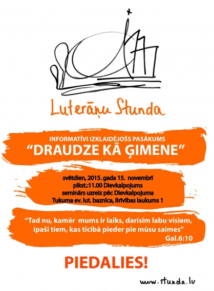 Kopš šā gada marta “Luterāņu Stunda” ir uzsākusi sadraudzības pasākumu "Draudze kā ģimene", viesojoties jau vairākās draudzēs Latvijā - Baldonē, Slokā, Salā, Balvos, Gulbenē, Olainē un citur. Draudzes tika aicinātas kopā pārdomāt, cik dzīva ir saziņa draudzes locekļu starpā, cik labi tie pazīst cits citu? Vai zina viens otra vārdu? Vai zina, kas nomāc vai priecē cilvēku, kas sēž līdzās baznīcas solā? Luterāņu stunda norāda, ka draudzei jākļūst par atbalsta punktu katra tās dalībnieka dzīvē. Draudzei jābūt kā otrai ģimenei, taču, lai tas notiktu, katram pašam jāpieliek zināma piepūle – jāpārvar “latviskās kautrības robežas”, jāpasniedz roka, jāatver acis, jāsāk sarunāties. Nu ciemiņi ieradušies arī pie mums, Tukumā. Svētdien, 15.novembrī pēc dievkalpojuma, visi aicināti uz šo interesanto, informatīvi izklaidējošo pasākumu.