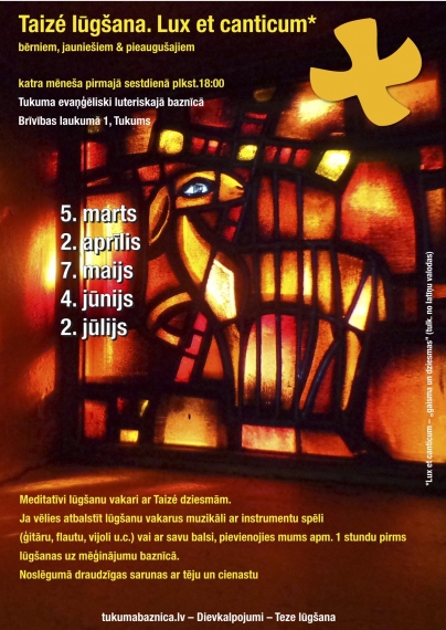 Sestdien, 2. aprīlī, plkst. 18:00 notiks Tezē lūgšanu vakars baznīcā, kurā piedalīsies pieaicināti baznīcas mūziķi. Tezē lūgšanu vakari Tukuma evanģēliski luteriskajā baznīcā ir ekumēniski un tajā var piedalīties ikviens. Pēc lūgšanas - sadraudzība baznīcas sakristejā. Tezē lūgšanas notiek katra mēneša pirmajā sestdienā.