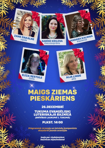 Koncerts “Maigs ziemas pieskāriens”, kas Tukuma luterāņu baznīcā izskanēs 26. decembrī, plkst. 14.00, veidots kā ceļojums laikā - repertuārs izvēlēts no klasikas, līdz pat mūsdienu komponistu darbiem, kas ļauj katram klausītājam atvērt sirdi un sadzirdēt, sajust patieso ziemas un Ziemassvētku noskaņu, ļauties svētku gaidīšanai, attīrīt dvēseli un rast prieku it visā. Koncerts būs īpašs ar tam radītām jaunām aranžējām tieši šim sastāvam, kas ļaus jau visiem zināmus skaņdarbus sadzirdēt pavisam jaunā skanējumā. Koncertēs Sabīne Krilova (mecosoprāns), Madara Kalniņa (pianiste), Elīze Sestule (čells), Zane Pakalne (vijole), Aija Linde (alts).