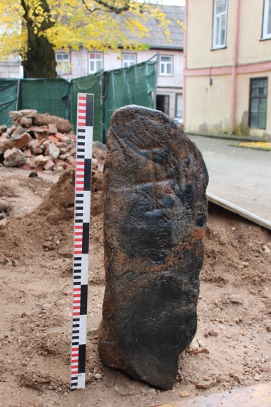 Unikāls atradums ir pie baznīcas ieejas sliekšņa izceltais zilā granīta akmens ar iekaltu teitoņu jeb spieķu krusta attēlu. Krustakmens, kas bijis daļēji ierakts zemē, apzīmējis seno baznīcas kapsētu, iespējams, pat kopš tās pirmsākumiem 14. gadsimtā. Šādi krustakmeņi Latvijā zināmi vien retums.