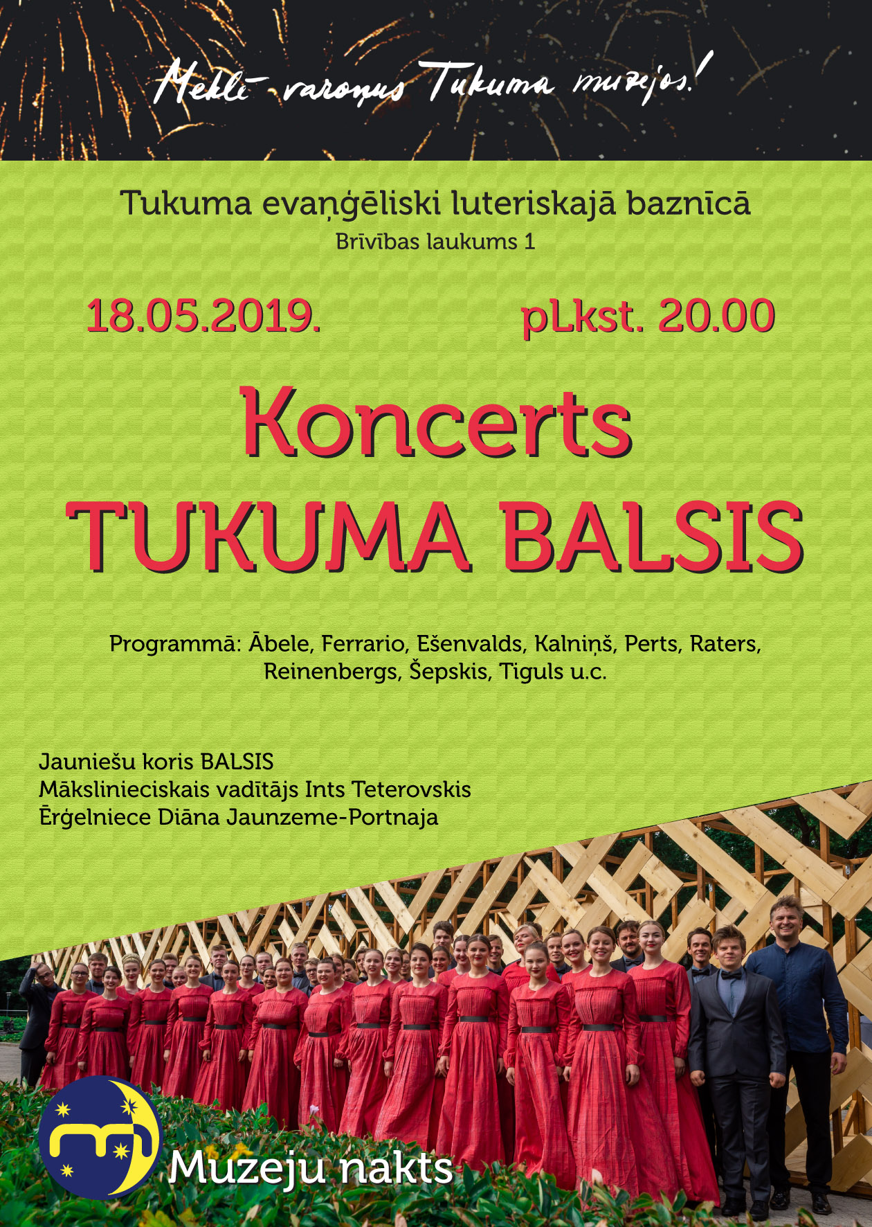 Tukuma evaņģēliski luteriskā baznīcā Muzeju naktī no pulksten 19.00 līdz 24.00 aicina apskatīt baznīcu un torni, kur izstādīta Durbes pils sagatavotā izstāde ”Gaišais ceļš”. Savukārt pulksten 20.00 visi laipni aicināti uz jaunieša kora “Balsis” koncertu, vadītājs Ints Teterovskis. Aicinājums ziedot baznīcas pamatu renovācijai. Adrese: Brīvības laukums 1, Tukums. Vairāk informācijas pa tālruni 63122305, www.tukumabaznica.lv
